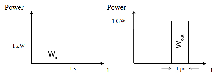 A pulsed power system converts a low-power, long-time input into a high-power, short-time output.